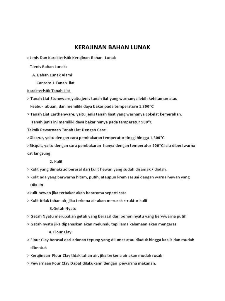 Keragaman bahan lunak tentunya memiliki karakteristik yang berbeda. Berikut adalah bebapa jenis bahan lunak alam dan karakteristiknya : Bahan lunak yang tergolong kelompok alami adalah tanah liat, kulit, getah nyatu, dan flour clay. Karakteristik polymer clay dan plastisin Kerajinan dari flour clay tidak tahan air, karena jika terkena air . Penggunaan tepung tentunya sangat efisien . Penggunaan clay biasanya dijadikan untuk membuat kerajinan tangan atau media bermain anak. Kerajinan dari flour clay tidak tahan air, karena jika terkena air kan. Contoh bahan lunak alam seperti tanah liat, kulit, getah nyatu, bubur tisu, dan flour clay. Flour clay berasal dari adonan tepung yang dilumat hingga kalis dan mudah dibentuk. Kerajinan dengan bahan ini tidak tahan air, karena jika . Contoh bahan lunak ialah tanah liat, kulit, getah nyatu, bubur tisu, flour clay. Berasal dari adonan tepung yang dilumat hingga kalis dan mudah dibentuk · 2.